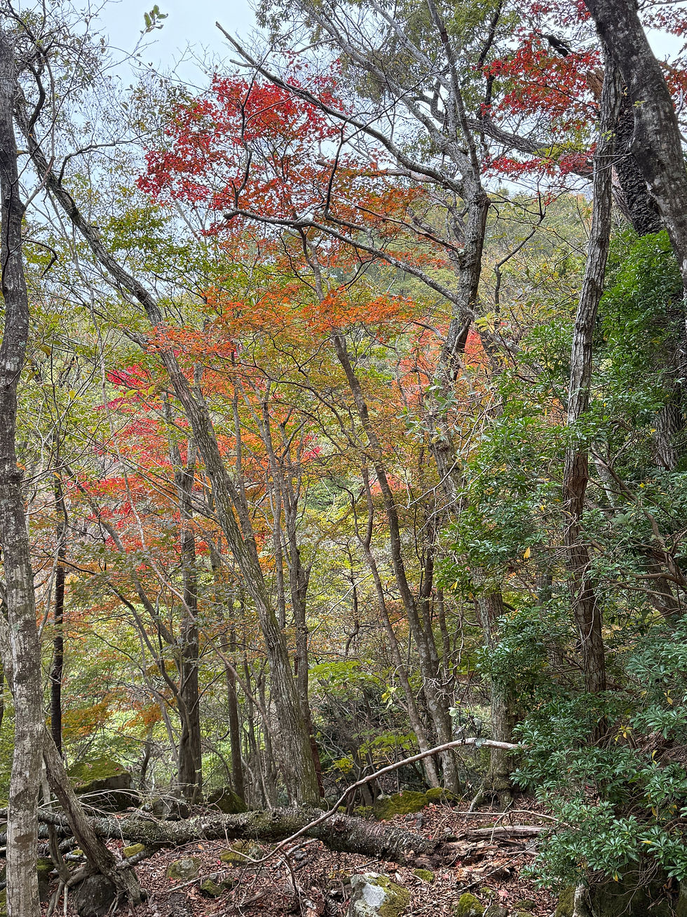 由布岳西峰まではCTで2時間15分程度。西登山口コースと合流する合野越(ごうやごえ)までは草原帯や樹林帯で、時折小雨が降ったものの紅葉が綺麗で幻想的な景色を楽しむことができました。
